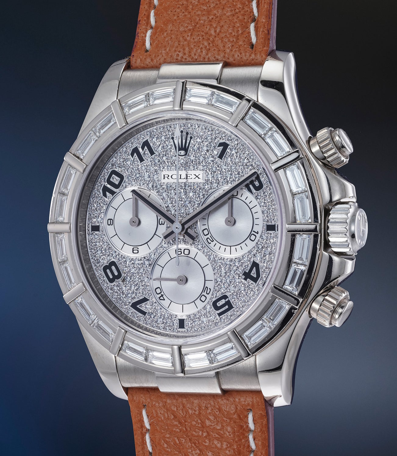 A highly uncommon and breathtakingly dazzling and attractive white gold chronograph wristwatch with baguette diamond-set bezel, diamond pavé dial with black Arabic numerals, additional black dial with diamond-set indexes and additional hands, guarantee and Pisa correspondence
