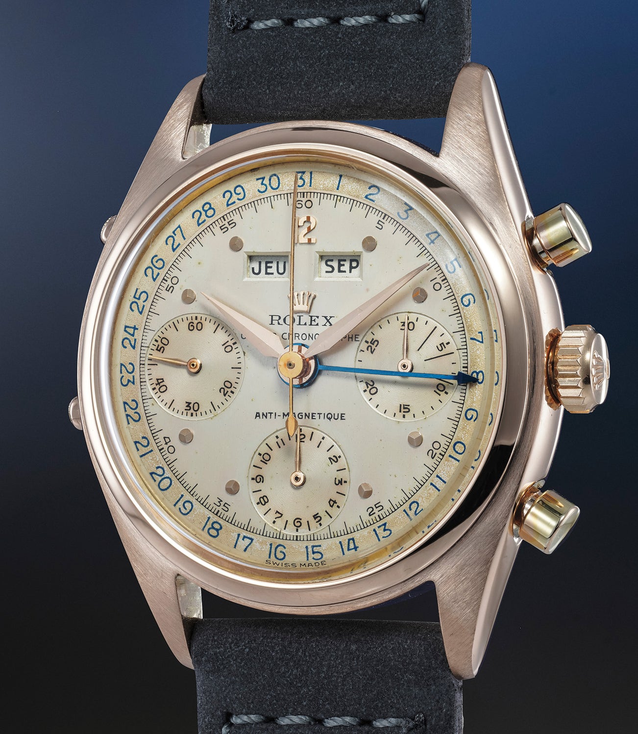 An extremely elusive, important and fresh-to-the-market pink gold chronograph wristwatch with triple calendar and two-tone dial