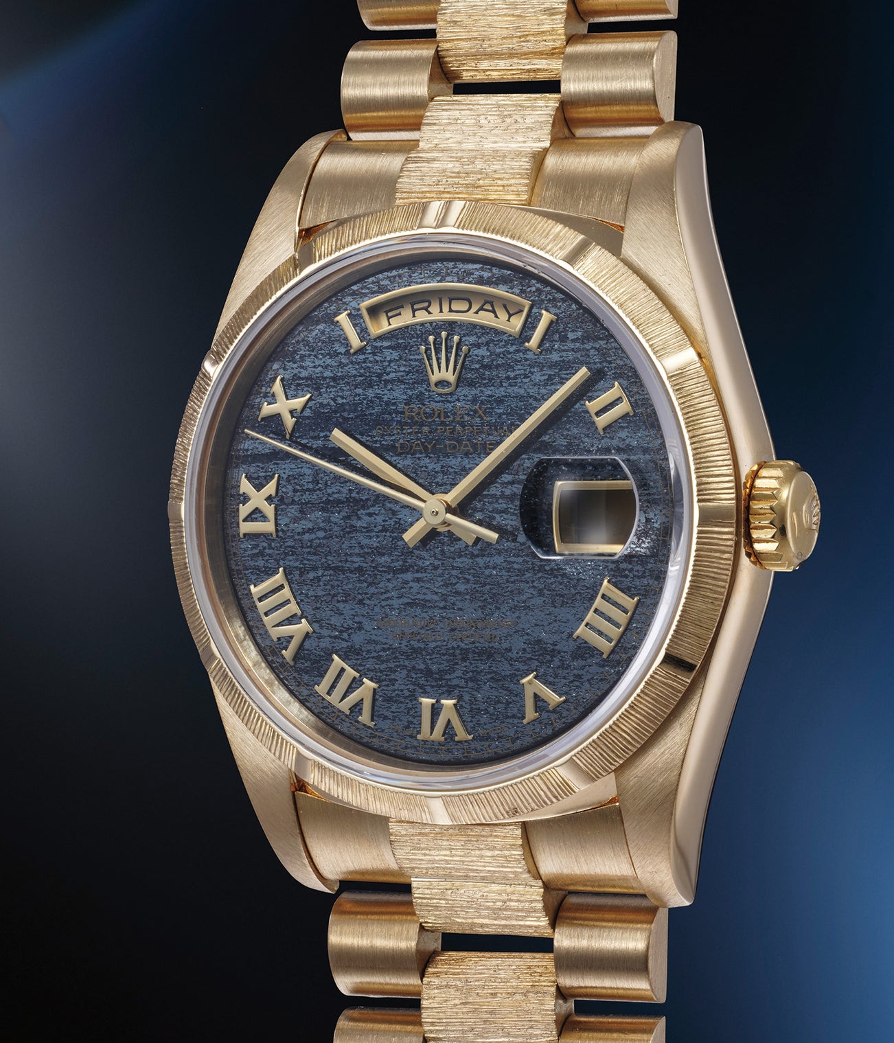 The “bark” finished bezel includes rectangular hour markers that line up perfectly with the applied Roman numerals on the dial creating a magnificent contract with the yellow gold present on the dial and around it from the case. To further balance the bezel, the Rolex President bracelet features bark-finished centre links, adding to its appeal. Cased at 36mm in diameter, the present reference 18248 Day-Date sits extremely well and comfortably on the wrist, with the additional "bark" accents giving the timepiece a certain appealing charm. The present example is fitted with Rolex’s calibre 3155, which features a double quickset function allowing for rapid adjustment of both the day and date.