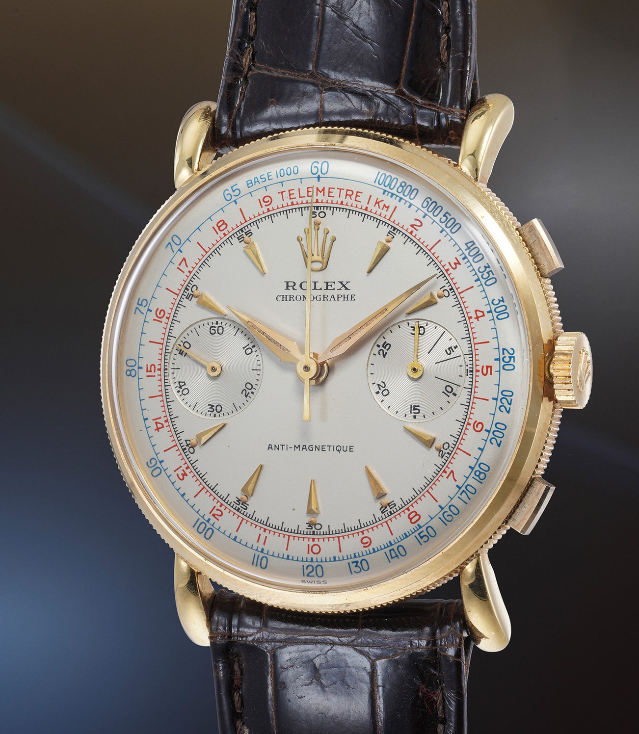 A very fine, rare and extremely well-preserved yellow gold chronograph wristwatch with silver dial, red telemeter and blue tachymeter scale