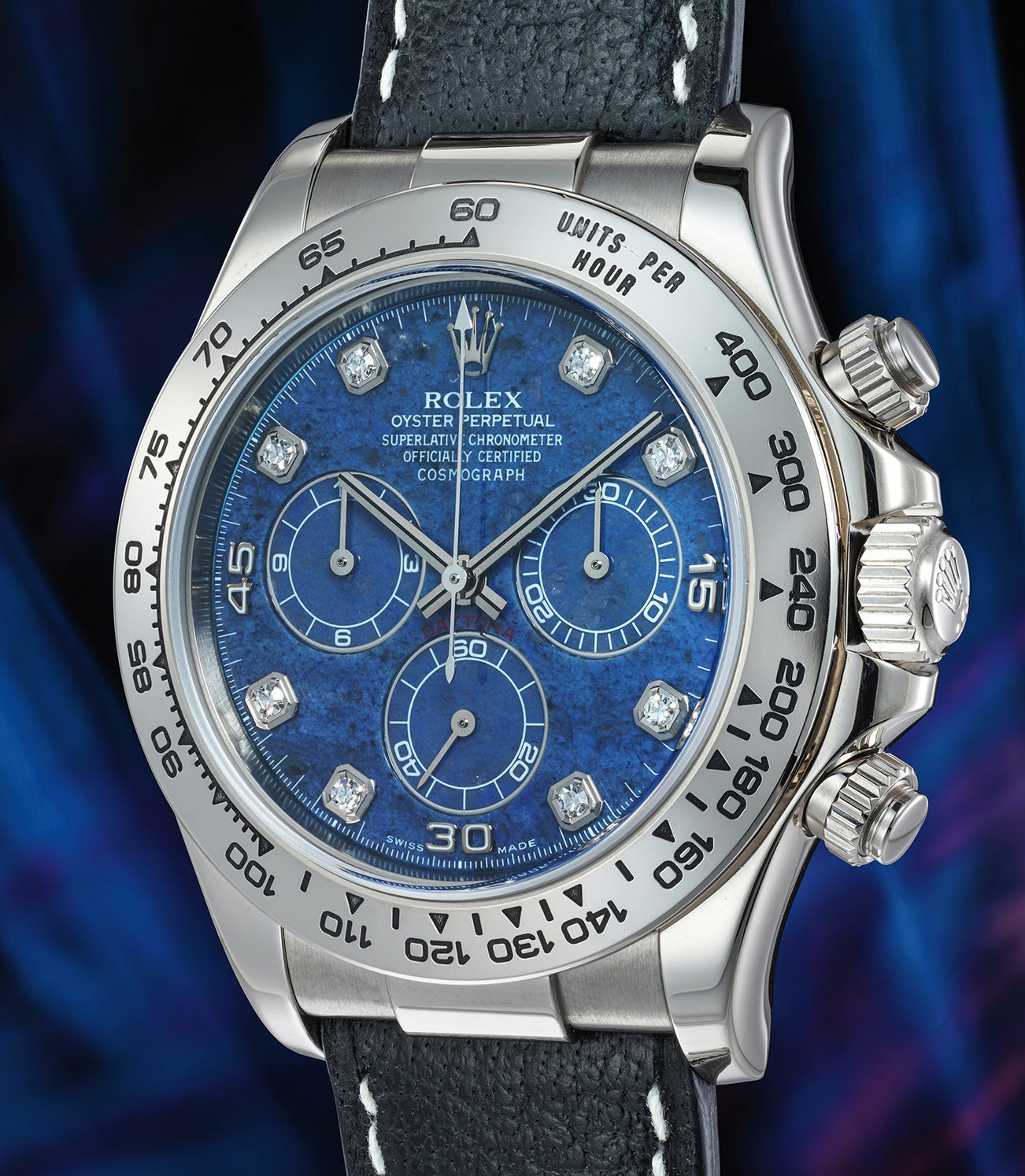 Preserved in excellent and impressive condition, the present reference 116519 is most notably fitted with a blue sodalite dial and diamond-set numerals. Rolex is particularly imaginative and innovative in its use of hard stone, and the present timepiece is no exception.