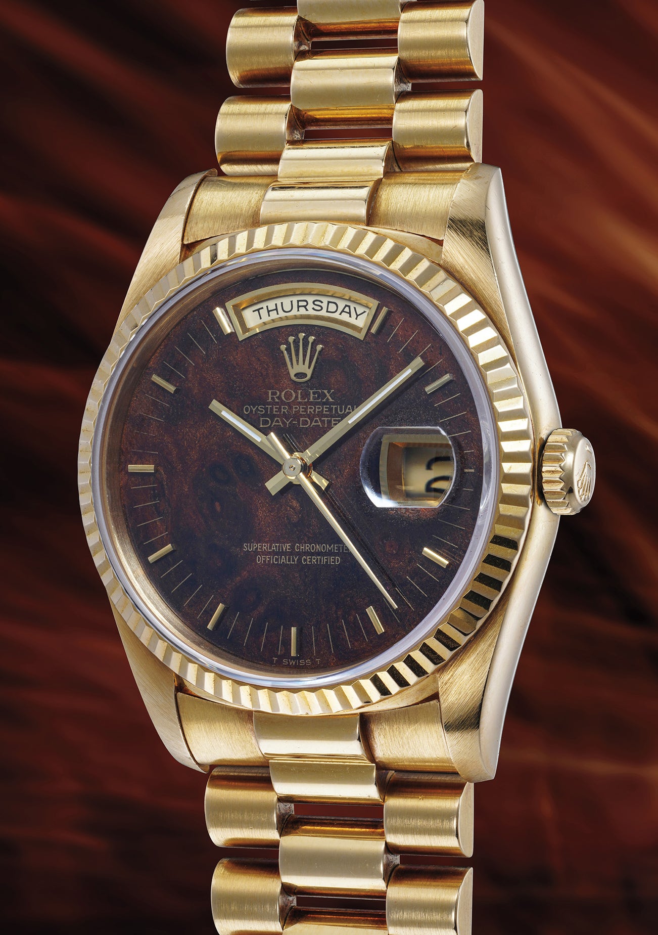 The present watch is a beautiful example featuring a briar root wood dial. The combination of yellow gold markers contrasting against the brown wood is particularly stunning.