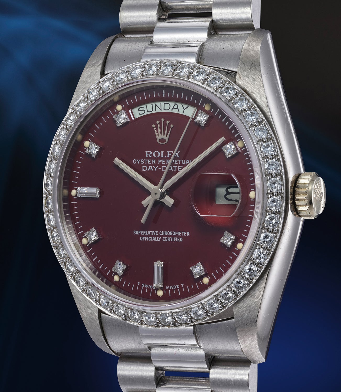 The present watch is a very early example of the reference, most likely made in the first year of its production, and furthermore preserved in absolutely astounding condition. The dial is simply flawless, and the sharpness of the case combined with the light surface marks and the unspoiled different finishes lead us to believe that it has in fact never been polished. On top of that, anecdotal evidence seems to lead to the conclusion that the present reference 18049 with burgundy Stella dial is part of a very restricted production made on request of a ruling Middle Eastern family. While there is unfortunately no way to confirm such a background to the piece, it is undeniable that the momentous aesthetic impact created by the white gold case shining with diamonds and the deep liquid red of its Oxblood dial is indeed fit for a king. Compounding to it the rarity and spectacular condition of the watch, the final result is an unmissable opportunity for the collector of rare vintage pieces.