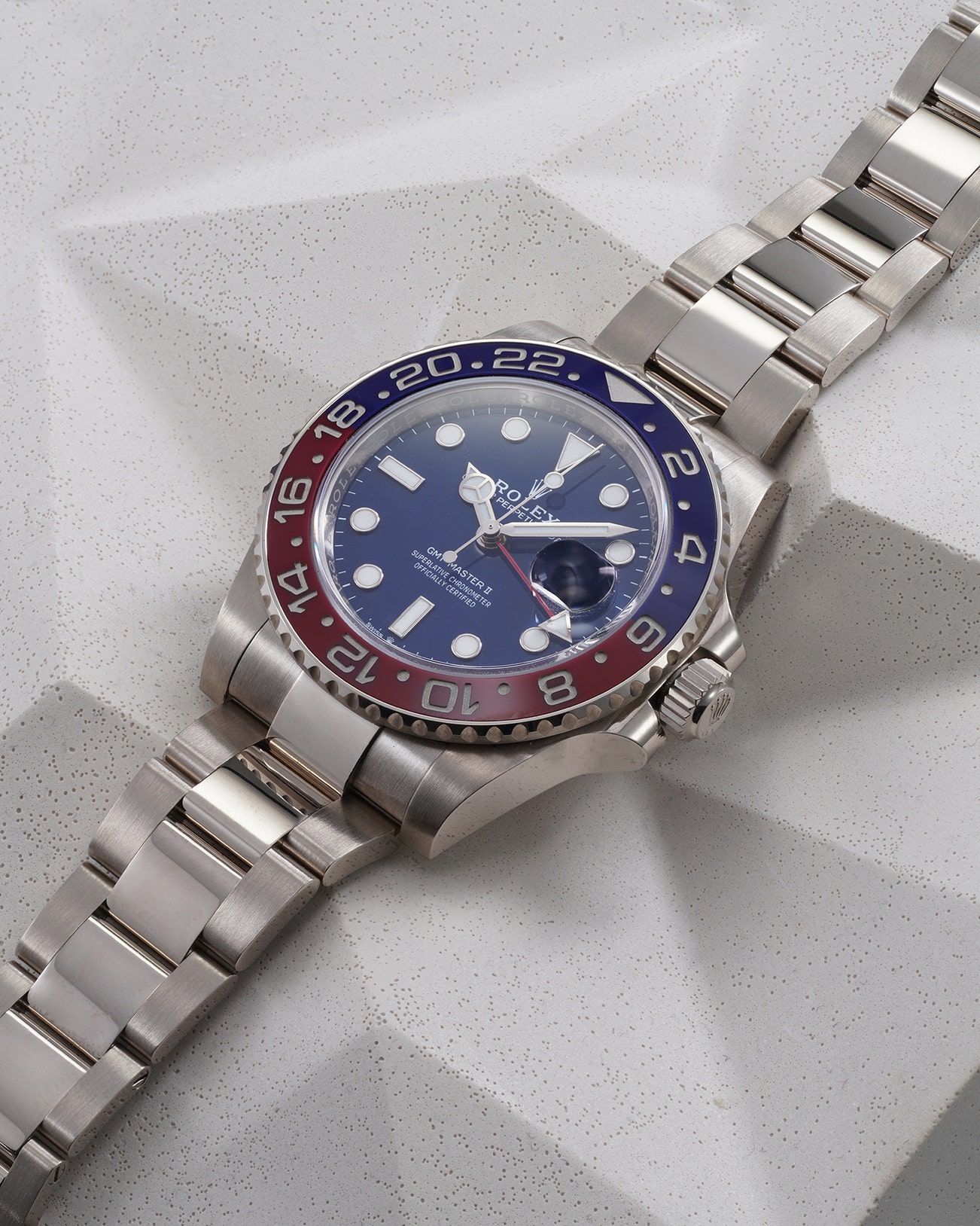 -Cased at 40mm in diameter, the timepiece sits extremely conformably on the wrist with the white gold case and bracelet giving the watch a pleasant heftiness and presence on the wrist. Sporty yet refined, the present Rolex GMT-Master II is considered to be one of the most sought after timepieces with its aesthetics remaining very much similar to the first iterations of the model, most notably with its bi-colored “Pepsi” bezel that many are fond of.