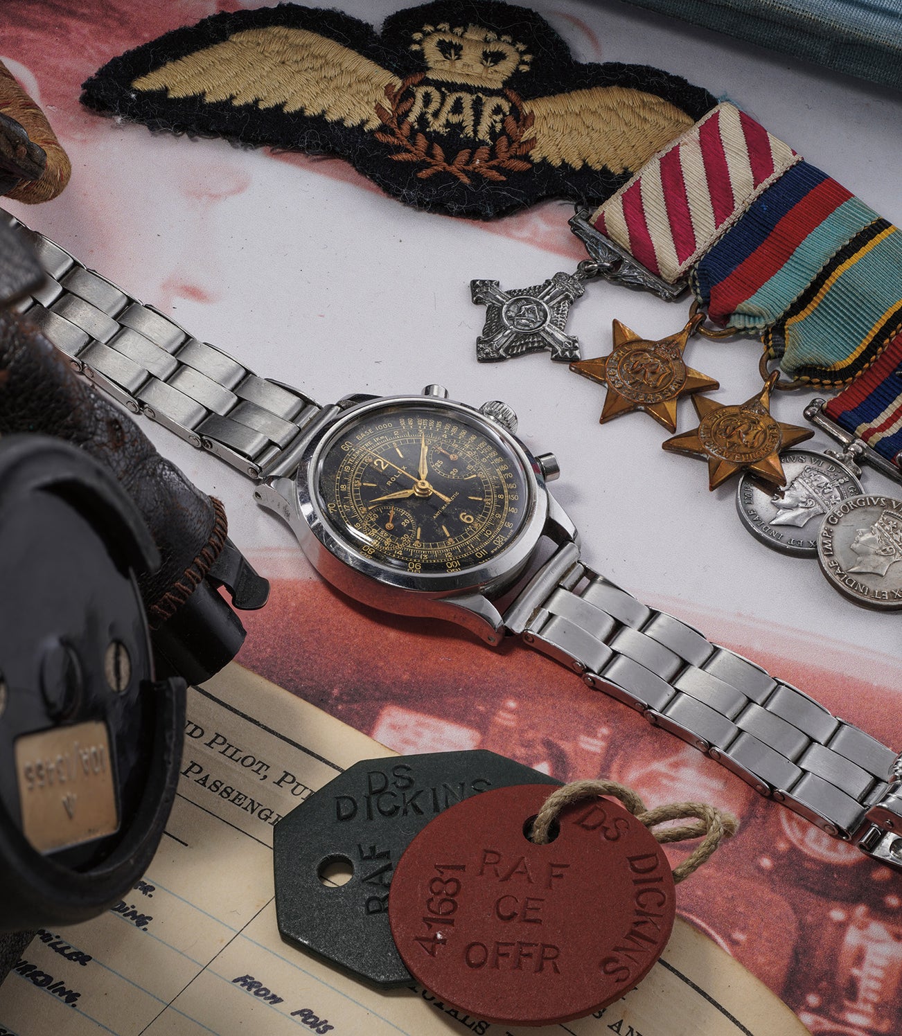Given the approximate production date of this watch, and the fact that Dickins’ 3525 (186’124) along with other known, notable POW watches of Williams (186’045) and Imeson (186’052) all fall within a tigserial range, we can surmise this watch was most likely delivered to the Flight Lieutenant Dickins whilst at Stalag Luft III, and almost certainly used in the planning of what we now know as The Great Escape of 1944. It is accompanied by a plethora of military accessories, including Squadron Leader Dickins’ “Top Secret clearance card”, typed & signed CV, a 1950s headphone-equipped leather helmet, two military caps, his dress medals and insignia and, most notably, three pilot’s logbooks. In superb condition and retaining its original luminous material, the present piece is further distinguished by the unusual ageing of the ‘straight signature’ dial.