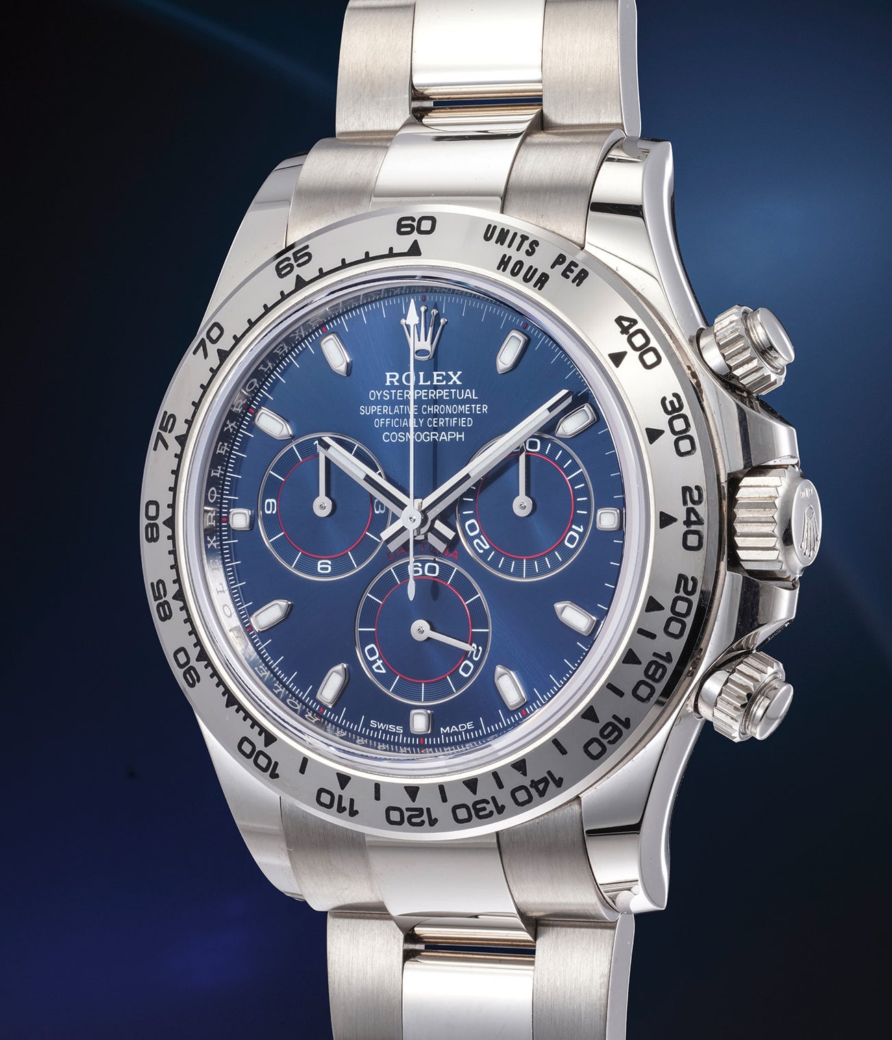 The present example Rolex Daytona ref. 116509 with its attractive blue dial is offered in absolutely excellent condition with its Rolex Guarantee dated September 23, 2021, product literature, wallet, presentation box and outer packaging.