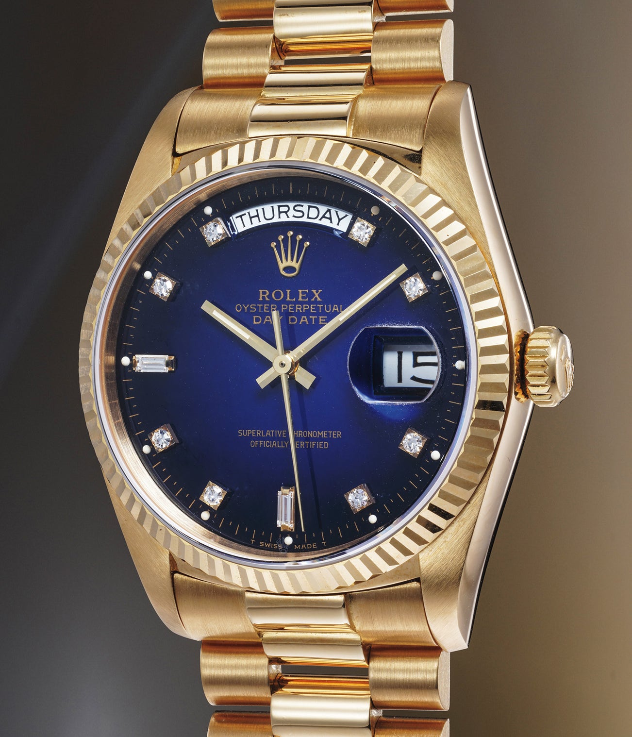 Displaying a beautiful blue dégradé dial, this Day-Date is adorned with a diamond-set markers. Lavishly cased in yellow gold, the combination between blue dial and brilliant case is astonishing.