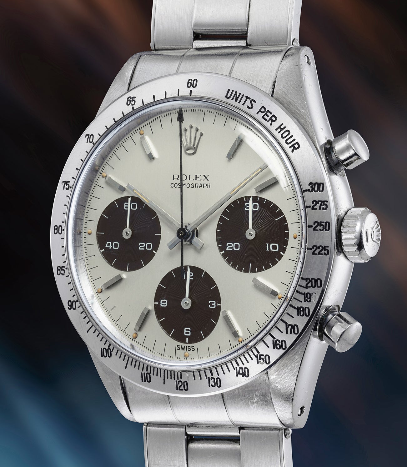 Most notably, the dial is a “Double Swiss” grené dial and grants the watch an incredible vintage vibe, only found in this early grené finish. The double Swiss designation is a rectification done by Rolex as the first Swiss is mostly covered by the case when the dial is mounted, thus prompting the company to add an additional clearly visible “Swiss” designation. Such “Double Swiss” dials can be considered the earliest “standard” dial iteration for the Daytona. The bezel as well represents the earliest iteration - MKI - found in the Cosmograph, most notably including the 275 designation, which will soon be abandoned in favour of a simple hash mark. The movement as well has something to impress the connoisseur with, as it is one of the few calibers 72B found in a Daytona. Employed at the very beginning of the production - and virtually identical to the most commonly found 722 - it is a rarity in its own and a joy for the scrupulous collector looking for the truly “first rendering” of a 6239. Furthermore, this coveted, early reference 6239 is made even more exceptional with its lovely and hardly ever seen espresso "tropical" subsidiary dials. They have aged uniformly from their standard black to an intense and dark brown tone, providing for an arresting contrast with the white dial.