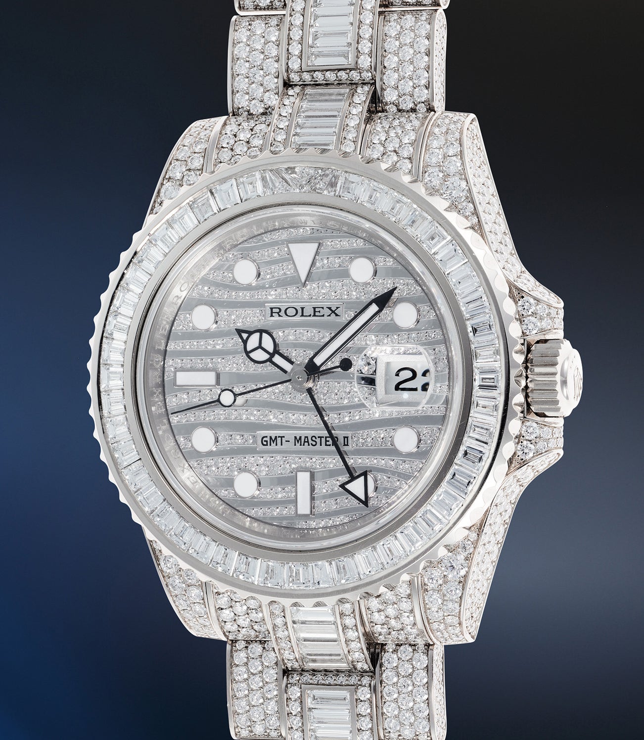 The only surfaces free of diamonds are the edges of the bezel, the crown, and the reverse of the case and bracelet. Otherwise, diamonds reign supreme on the majority of the visible surfaces of the 116769TBR. The ultimate flagship, most expensive Rolex ever at the time of its release, it maintained that distinction for over a decade, being upstaged in the past few years by some off-catalogue Rolex offerings. Blackened white gold surrounds on the handset give legibility to the dial, which is complemented by aquatic, wavy pavé stripes. Unusual and rarely seen in Rolex gem-set watches, even the sides of the bracelet are pavé diamond-set as well.
