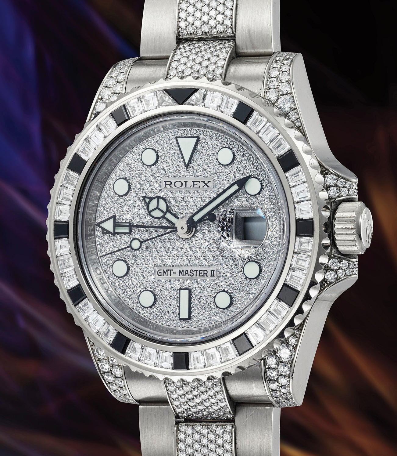 The present example is a variation on the theme, characterised by an incredibly striking monochrome appearance. As defined by its suffix “SANR”, the bezel of this piece is adorned with black sapphires (Sapphire NoiR) and diamonds, which dramatically alter the overall looks of the piece. The colourful red/blue bezel in in this case exclusively black and white, granting to the watch both aesthetic boldness and ultimate readability (even more impressive in a gem-set piece)