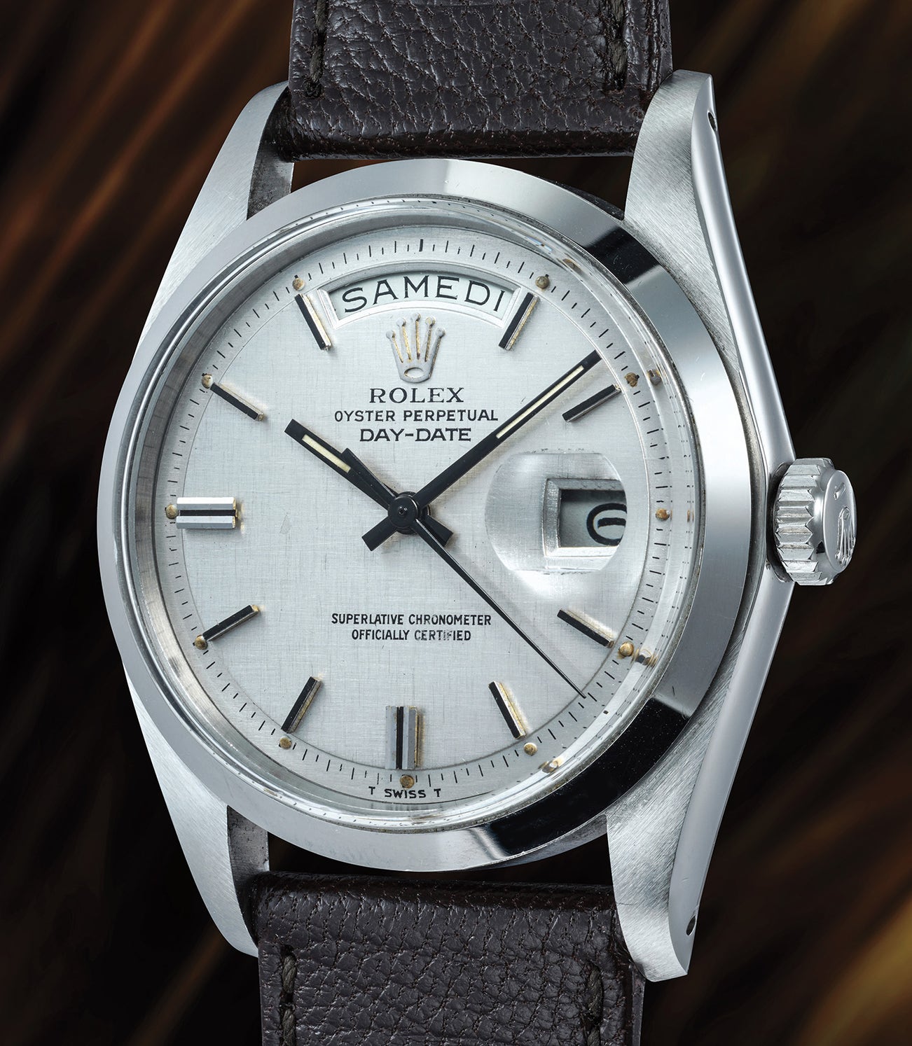 As they say, however, there are exceptions to every rule, including the “no steel Day-Date” one. As it turns out, an absurdly restricted number of prototype/scholar pieces have in fact been made in stainless steel. One example (movement no. 0004547) is portrayed in John Goldberger’s Rolex “bible” 1000 Superlative Rolex Watches. Two more were sold by Phillips in 2018 (no. 0005073) and in 2019 (no. DD411420), and a fourth example (no. DD14749)appeared in this salesroom in November 2021. Another example (movement DD081221) is also known from the public market. They all bear no case number, the same as the present piece, indicating they were prototype pieces.
