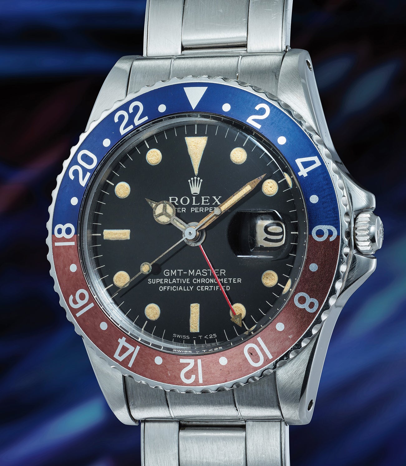 The present watch is an exemplary version of the hallowed reference 1675. Preserved in impressive condition, it most notably displays a beautiful rich black lacquer dial with beautiful luminous markers. There is no telling how any dial will age, yet this particular one has aged beautifully and now displays strong and charismatic "pumpkin" patina - a detail that is highly sought after by collectors today. Furthermore, the dial is glossy, shiny and mirror-like, displaying no signs of cracking which is incredibly rare today. The bezel displays a red and blue tone, and the riveted bracelet is stamped for the fourth quarter of 1965, corresponding with the age of the watch.