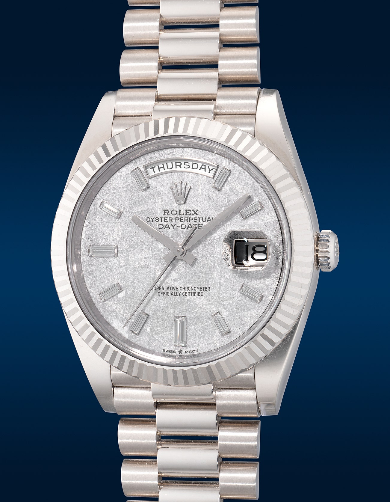 - With the perfect combination of a white gold exterior, meteorite dial, and diamond-set indexes, this white gold Day-Date ref. 228239 bears a distinctly sleek appeal that is sure to turn heads. Whether worn for a special occasion or as an everyday timepiece, this well-preserved watch is a true testament to the artistry and craftsmanship of the brand and is further accompanied by its original accessories.