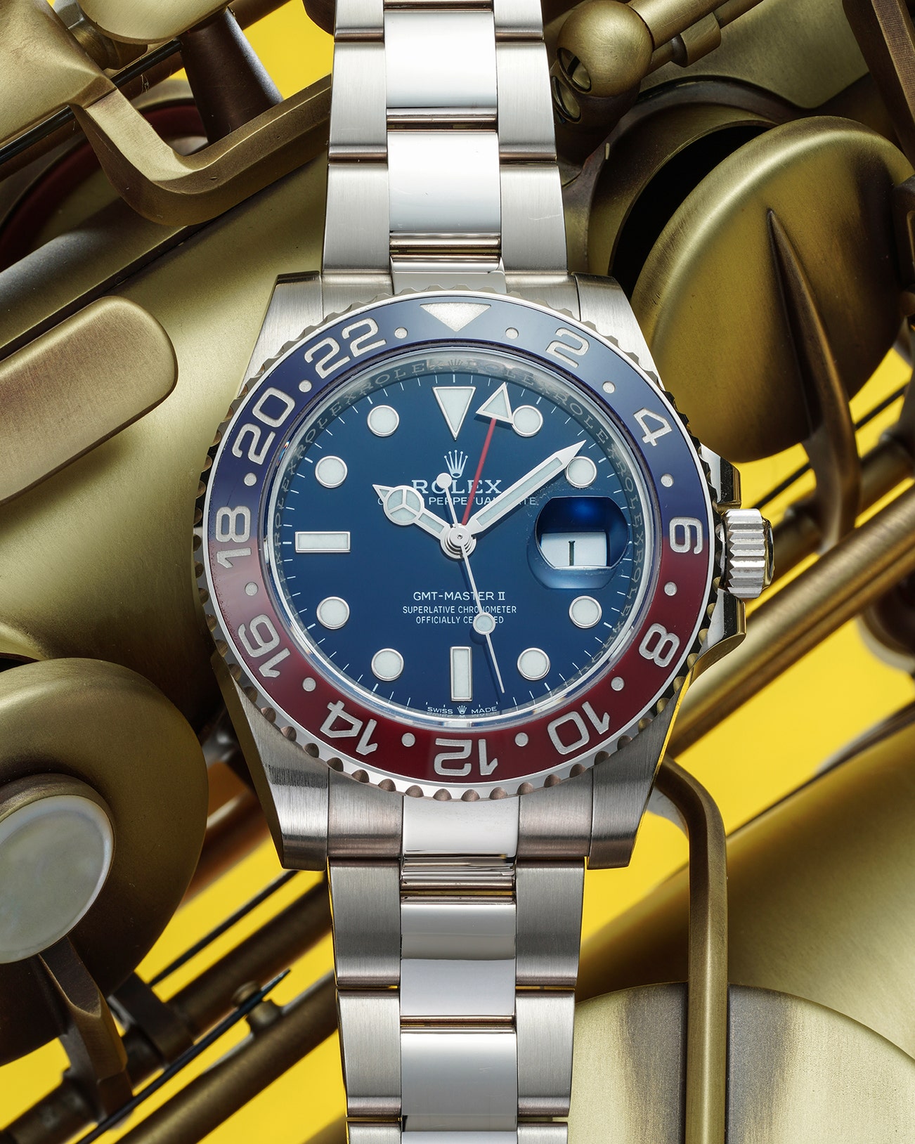 -Cased at 40mm in diameter, the timepiece sits extremely conformably on the wrist with the white gold case and bracelet giving the watch a pleasant heftiness and presence on the wrist. Sporty yet refined, the present Rolex GMT-Master II is considered to be one of the most sought after timepieces with its aesthetics remaining very much similar to the first iterations of the model, most notably with its bi-colored “Pepsi” bezel that many are fond of.