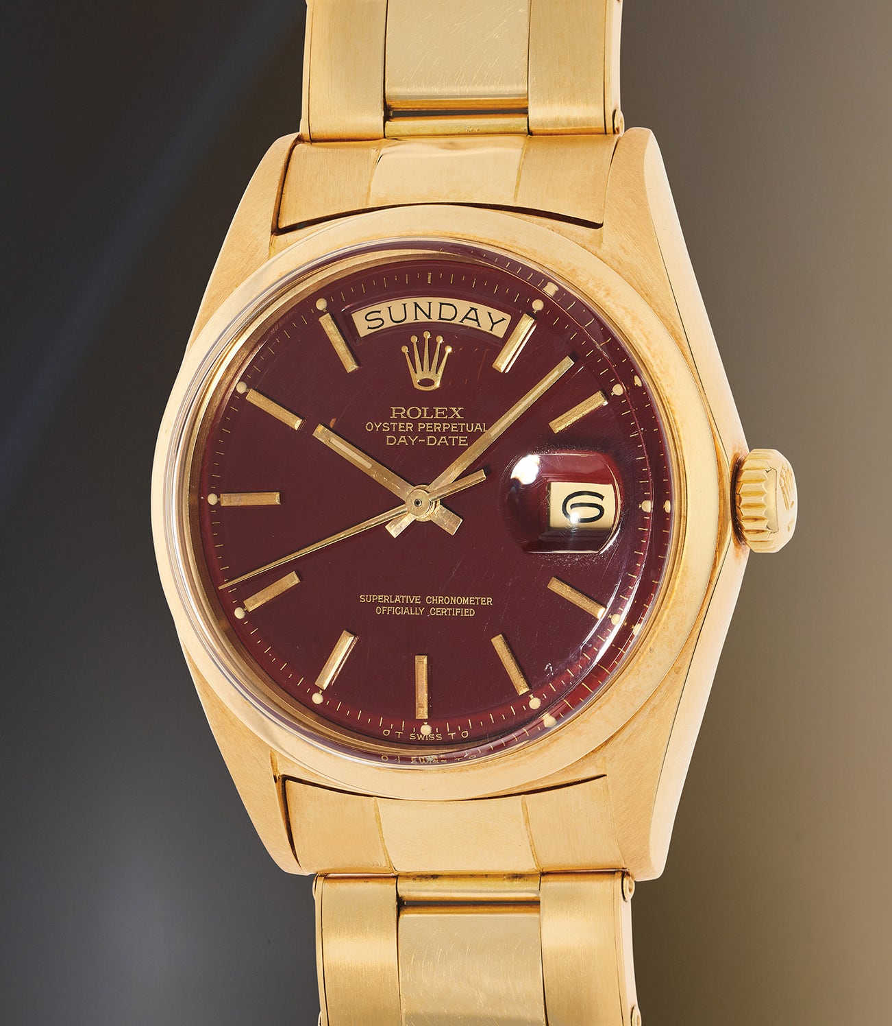 The present Day-Date, an uncommon reference 1802 fitted with a coveted smooth bezel, features a rich and glossy burgundy (also referred to as "oxblood") "Stella" dial, which contrasts vibrantly against the slightly patinated yellow gold case. Despite being over fifty years of age, the dial still retains its highly glossy finish, just as if it left the factory yesterday. The dial is preserved in outstanding condition, with all luminous dots still intact. The case is similarly well-preserved, and still retains strong hallmarks on the underside of the lug.
