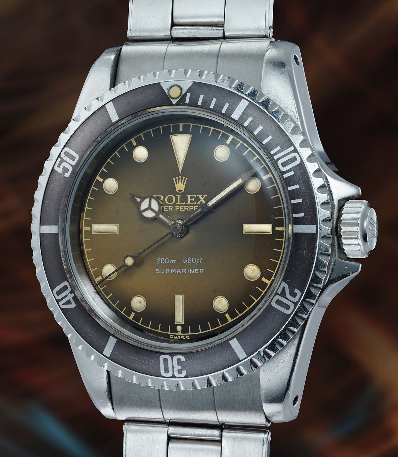 Undoubtedly, the dial is the showstopper. Over time, it has turned from black, to a rich and beautiful brown tone which has taken a "degrade" effect over time. The brown colour emanates outwards, and becomes even golden in places, making the dial look like it radiates light. Chocolate brown tones are present throughout, giving the timepiece an absolutely unmistakable appearance. There is no telling how a black lacquer dial will "turn" over time, and this one is equally parts astonishing as it is beautiful. This dial furthermore presents another surprise: the small dot at 6 o’clock unmistakably identifies this as an “exclamation mark” dial - the name coming from the ensemble dot and index, which resembles an exclamation mark. Such dials were in production only during a short period of time between 1961 and 1962 and are one of the first attempts to identify a lower radiation count compared to earlier dials. even the case is preserved in exceptional condition, with crisp bevels and thick proportions.