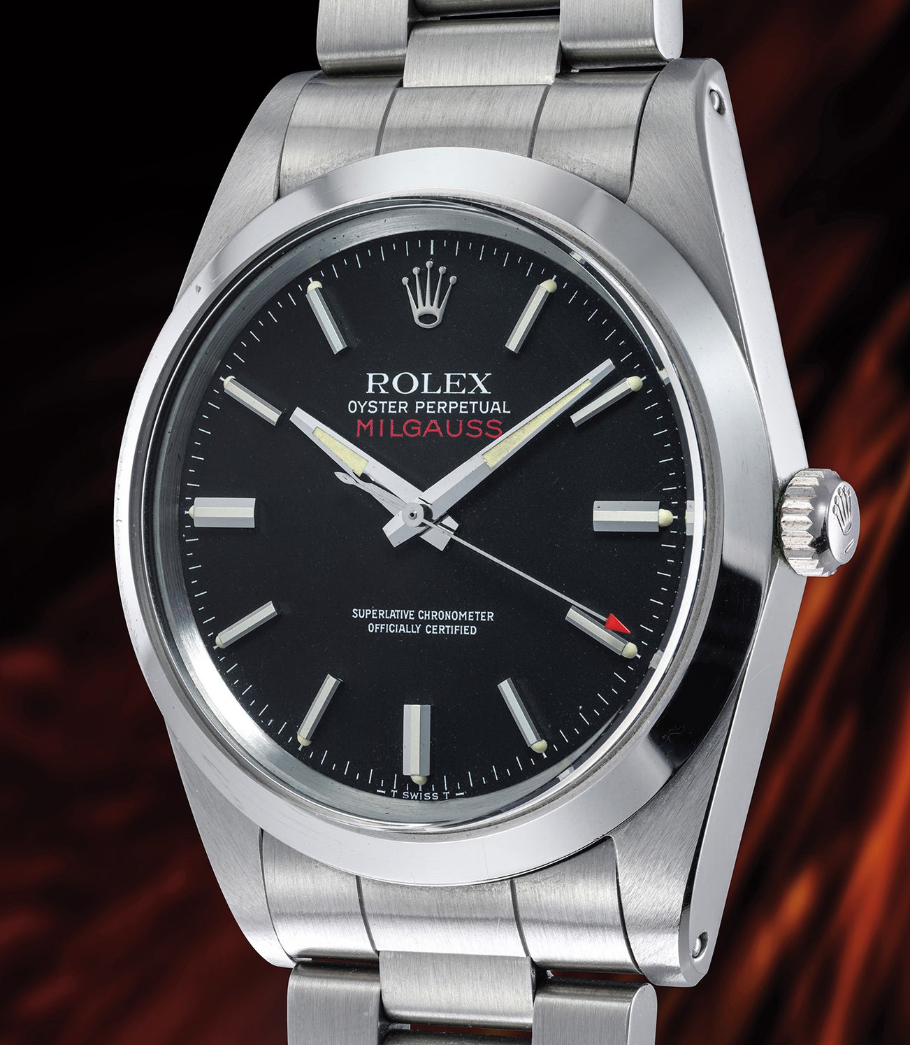 The result was the Milgauss, deriving its name from the Latin “mille” meaning a thousand, and “Gauss” representing the unit measure for magnetism. Accordingly, it could withstand exposure of up to 1000 Gauss with no effect on accuracy, whereas a typical watch movement can only withstand up to 70-90 Gauss. In the early 1960s, the newly introduced Rolex Milgauss reference 1019, like the present lot, replaced the original two versions: references 6541 and 6543. Significantly thinner than its predecessors, it was manufactured until 1990 and was available only in stainless steel.