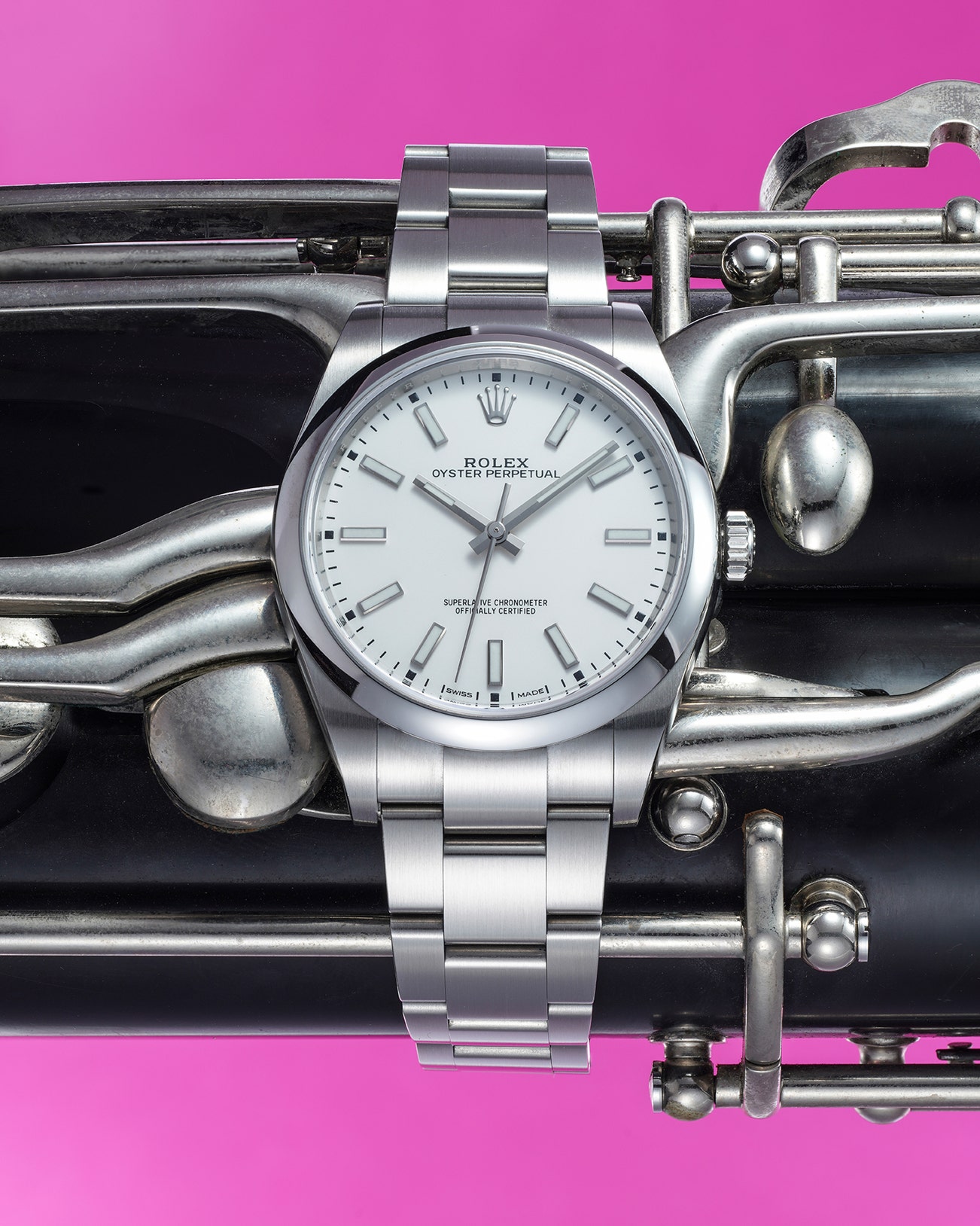 -Offered without reserve, the present example Rolex Oyster Perpetual features a white dial, that is offered in barely worn overall condition and complete with its full set of accessories. For those who may think that the lacquer coloured examples are too exuberant, this clean example is a wise choice.