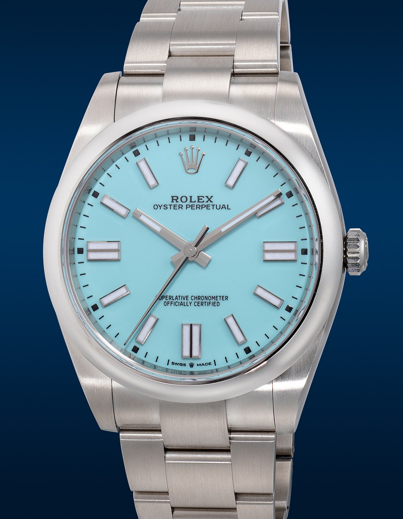 - Offered in 41mm (ref. 123400), 36mm (ref. 126000), and 31mm (ref. 277200) sizes, the present “like-new” example is the full-size 41mm version with the highly desirable "Tiffany" dial. Discontinued by Rolex in Spring 2022, it remains one of the most sought-after contemporary Rolex watches. Complete with all original accessories, this discontinued classic is a must-have for collectors.
