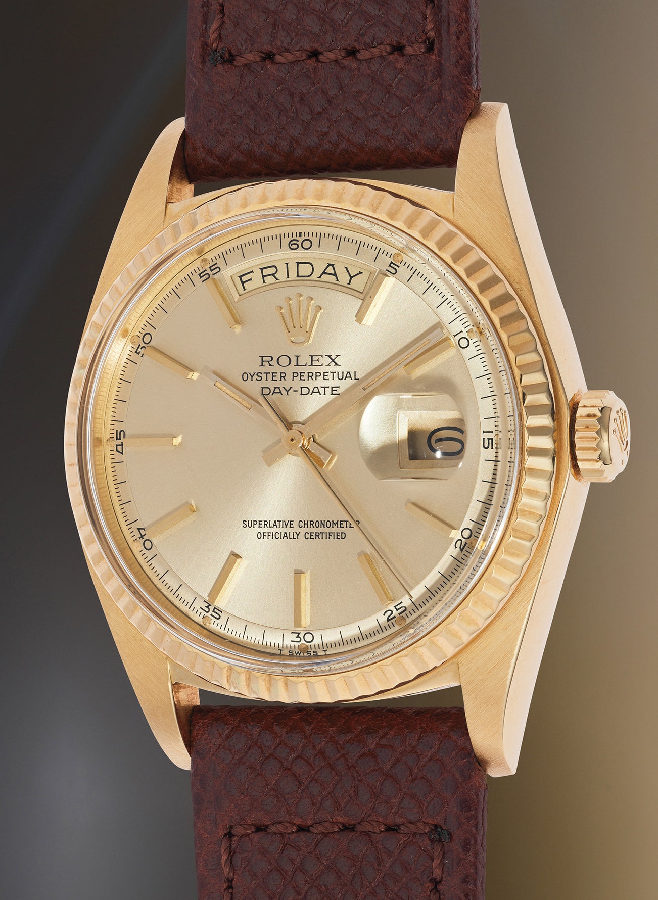 The present Rolex Day-Date ref. 1803 was manufactured circa 1972, bearing a 3.46 million serial, and featuring the classic combination of an 18k-yellow gold case paired with a fluted bezel and a champagne-colored “pie-pan” dial. Of course, it goes without saying that the model's signature day-of-week display is right where it should be, at 12 o'clock, complementing the three o’clock date window perfectly. Preserved in outstanding condition, it’s an extremely versatile and timeless choice for any collection.