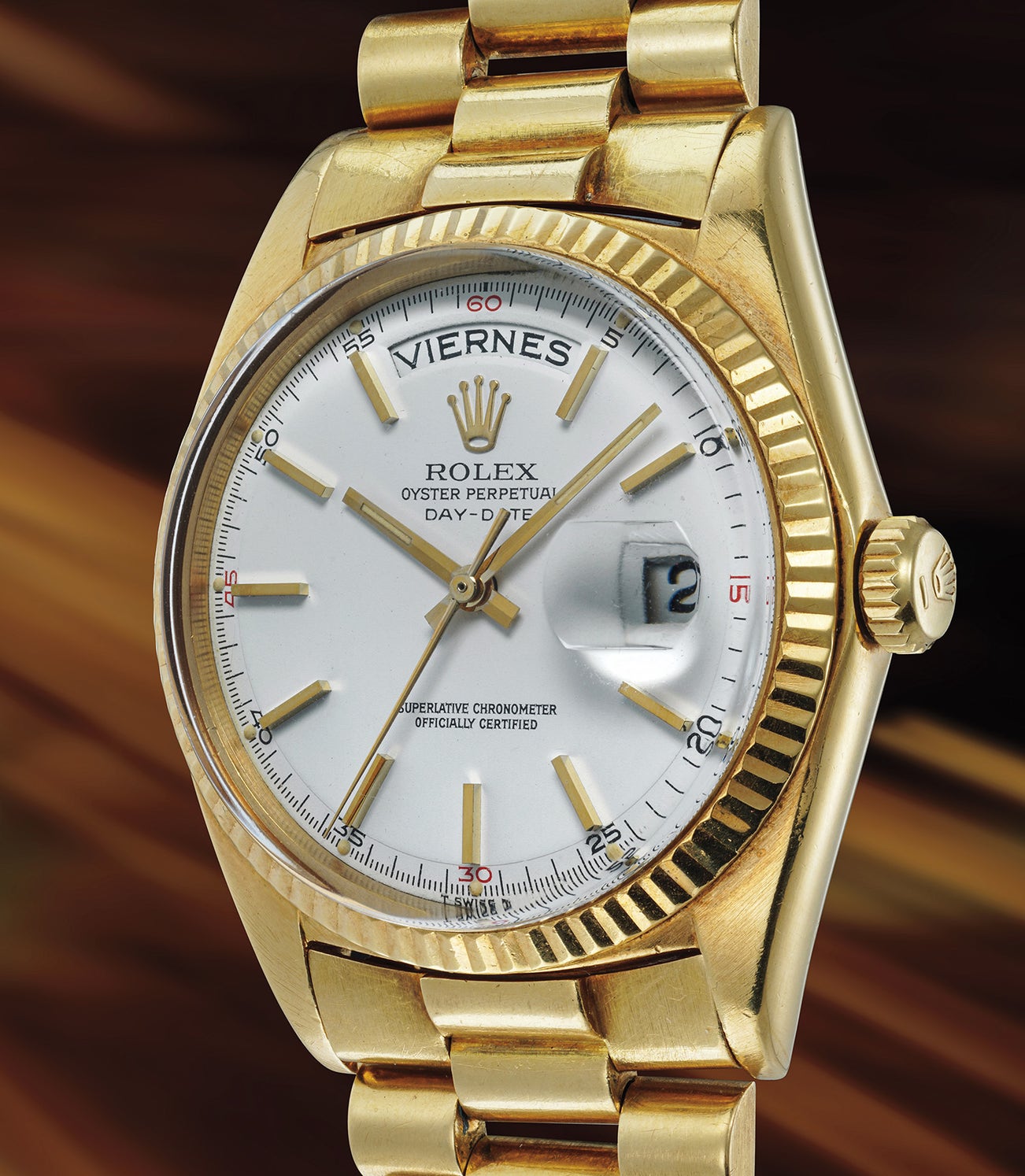 The present model in yellow gold features a beautiful snow-white step dial providing for a very elegant and contemporary combination. Paying close attention one can notice that the numerical lettering at the quarters, 60, 15, 30 and 45, are in red, hence the nickname ‘red quarters’. Featuring a spanish day disk, the overall aesthetic of the watch is extremely captivating. In overall excellent condition, the timepiece features an extremely well preserved case and president bracelet.