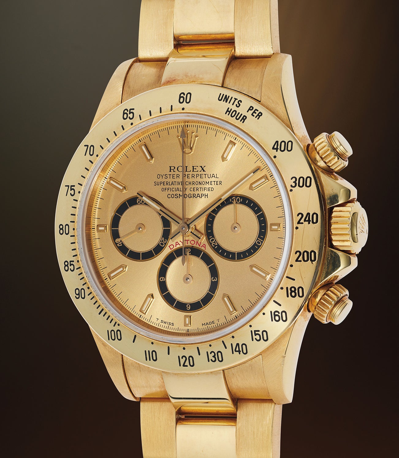 Powered by the cal. 4030, a Rolex-modified Zenith El Primero movement, it was the most reliable self-winding chronograph movement available in the market at the time. Early examples of the reference featured the rare and desirable “inverted 6” dial, such as the present lot. The most probably unpolished case has developed a rosy patina from lack of wear and use, and the monochromatic gold livery offers a warmth and flamboyance highly desired by collectors.