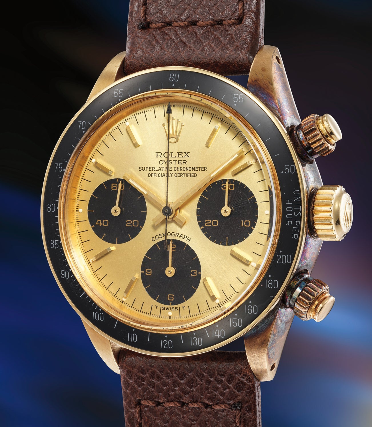 The present watch is rendered extraordinary due to its exceptional state of preservation. A thin layer of patina has developed on the case over time, showing how it has been untouched over the years. Furthermore, all hallmarks are crisp and present. The watch even retains its green caseback sticker, adding another layer of collectability.