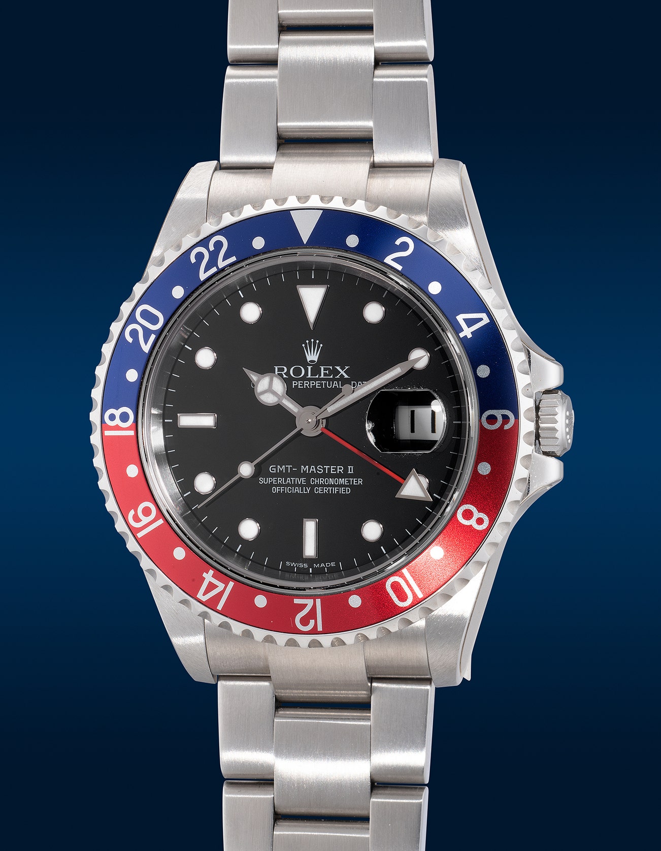 - Preserved in its ‘new-old-stock” condition, this Rolex GMT-Master II remains absolutely unworn. With its factory stickers remaining intact on the casebands and clasp, the present example with a strikingly rich red and blue Pepsi bezel is certainly a must-have in any collector’s collection.