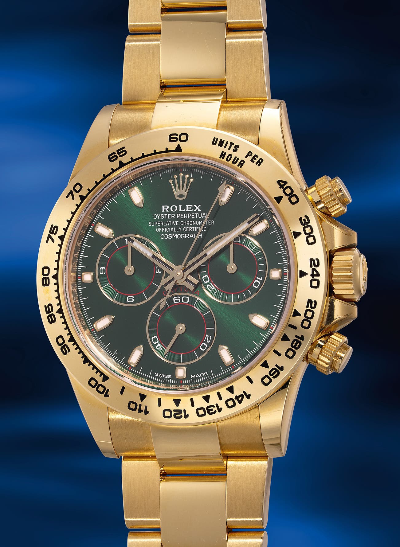 The dial, described as vert foncé, features rich green tones with red accents. It is a clever design that visually balances the closely spaced subdials using bold chapter rings. Housed in an 18K yellow gold case, the watch is powered by Rolex’s in-house calibre 4130, a robust and reliable automatic chronograph movement known for its precision and durability.