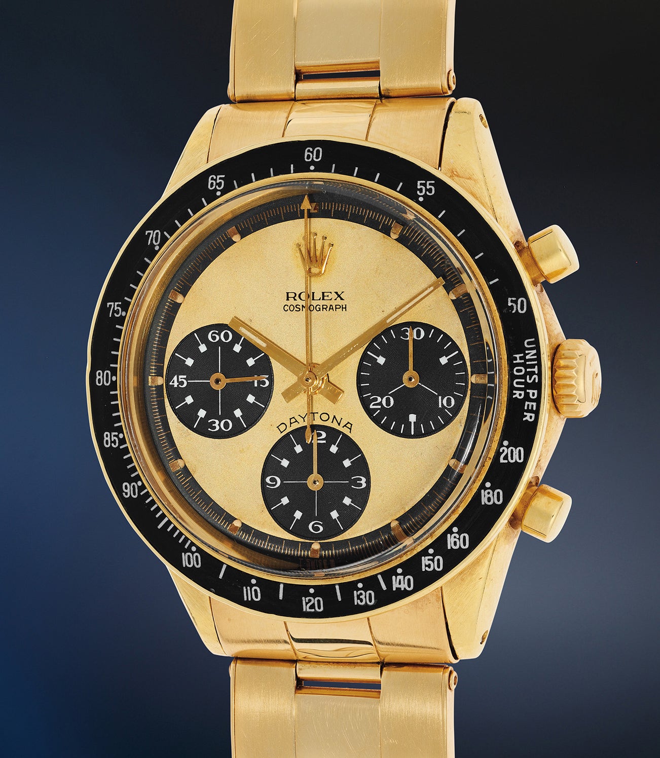 An exceptionally rare, extremely attractive, and important yellow gold chronograph wristwatch with “Paul Newman Lemon” dial and bracelet