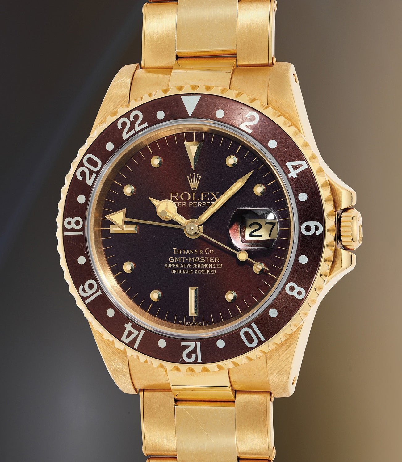 The present example is an exciting and very rare find, enhanced by the signature of the prominent New York jeweler and retailer “Tiffany & Co” on the dial at six o’clock above the model name. Its bold brown dial and “nipple” luminous hour markers are well preserved, and the case remains in excellent condition with crisp hallmarks. Elevating its desirability, the watch is accompanied by its original Rolex warranty stamped Tiffany & Co. Double-signed dials are a rare find for any Rolex watch, and this stunning GMT-Master is a wonderful opportunity for a passionate collector.
