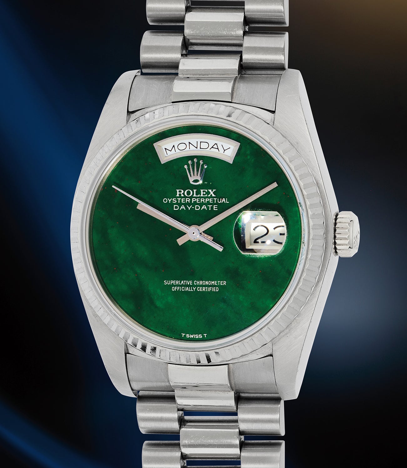 The present Day-Date from circa 1984 falls into one of the rarest categories of the model. The reference 18039, was first introduced by Rolex in 1978, upgraded from the famed and much-loved ref. 1803, most notably with a sapphire crystal. Encased in white gold, the present example features an extremely rare “jasper” dial. Further enhancing its importance is the fact that the dial’s color is a deep and vibrant monochrome green shade, reminiscent of the color the brand itself is associated with.