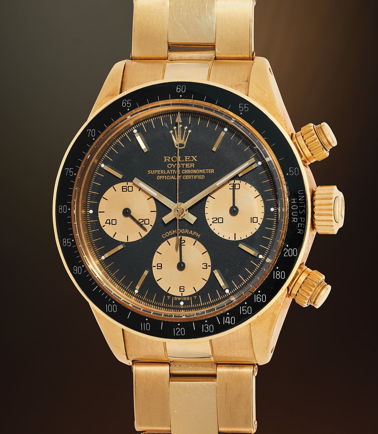The present watch, with its robust 18 karat yellow gold case and screw-down pushers, combines both utilitarian form with refined style. This motif continues on the dial, featuring the sporty chronograph layout typical of a Rolex Daytona, but accented by shimmering gold sub dials, text, and outer seconds track. Fitted with a modern service dial by Rolex, the dial is an extremely faithful and virtually identical replacement for the vintage original. The matching gold hands and indices along with the applied gold coronet complement the watch. Its appeal is further accentuated by the matching cream-colored luminous plots and hands all set on the eye-catching black dial. Its striking black on gold configuration, as well as its strong case proportions result in a highly attractive and wearable example for the collector.