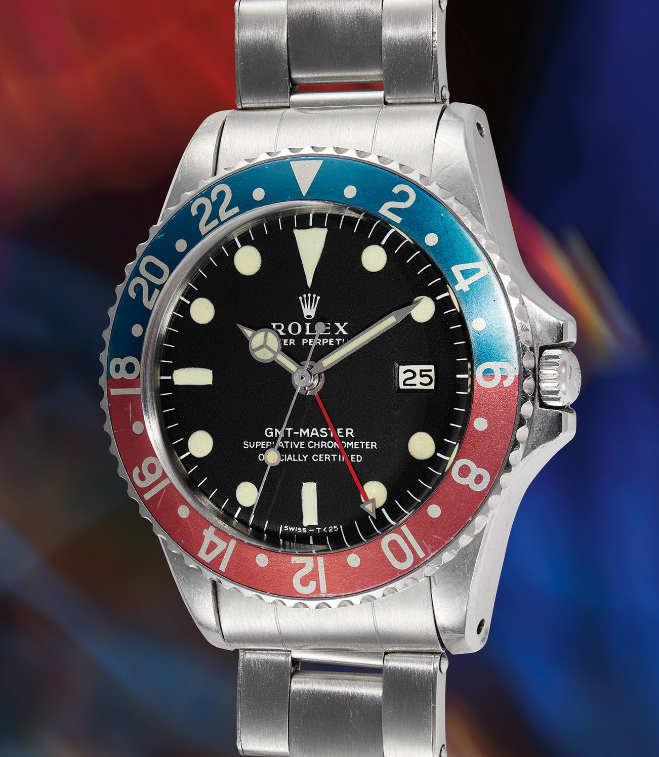 The earliest matte dials fitted to cases bearing the 1.6 million serial number are known to collectors as the “Mark 0” type dial. These dials are printed in the exact same manner as the final version of the glossy gilt dial, known as “Type C”, with all the same characteristics. As Rolex scholarship is always evolving, the “Mark 1” dial was previously thought to be the earliest iteration, but the uncovering of the early iteration led to a new additional classification. These early “Mark 0” dials are paired with the small GMT hand seen on galvanic dial, gilt printing 1675s.