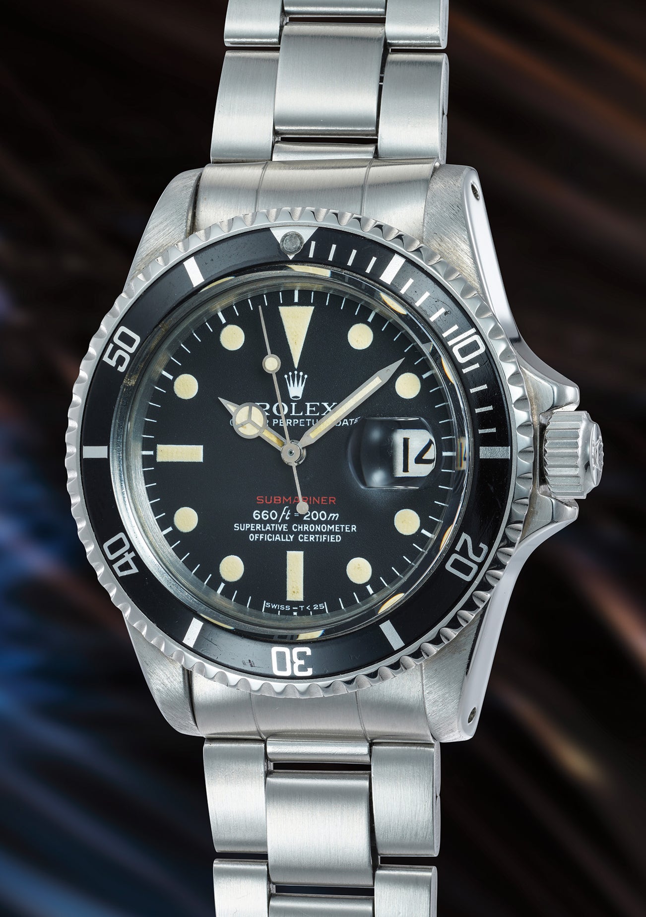The present watch is fitted with a Mk V dial characterized by a "Feet First" designation with "Submariner" in red directly on the dial. The dial is preserved in excellent and attractive condition, with charming patina on the luminous markers that matches the hands. Furthermore, the case is preserved in excellent and impressive condition with crisp bevels and sharp finishes. It is complete with its Rolex guarantee dated March 5, 1974, wallet, presentation box and outer packaging.