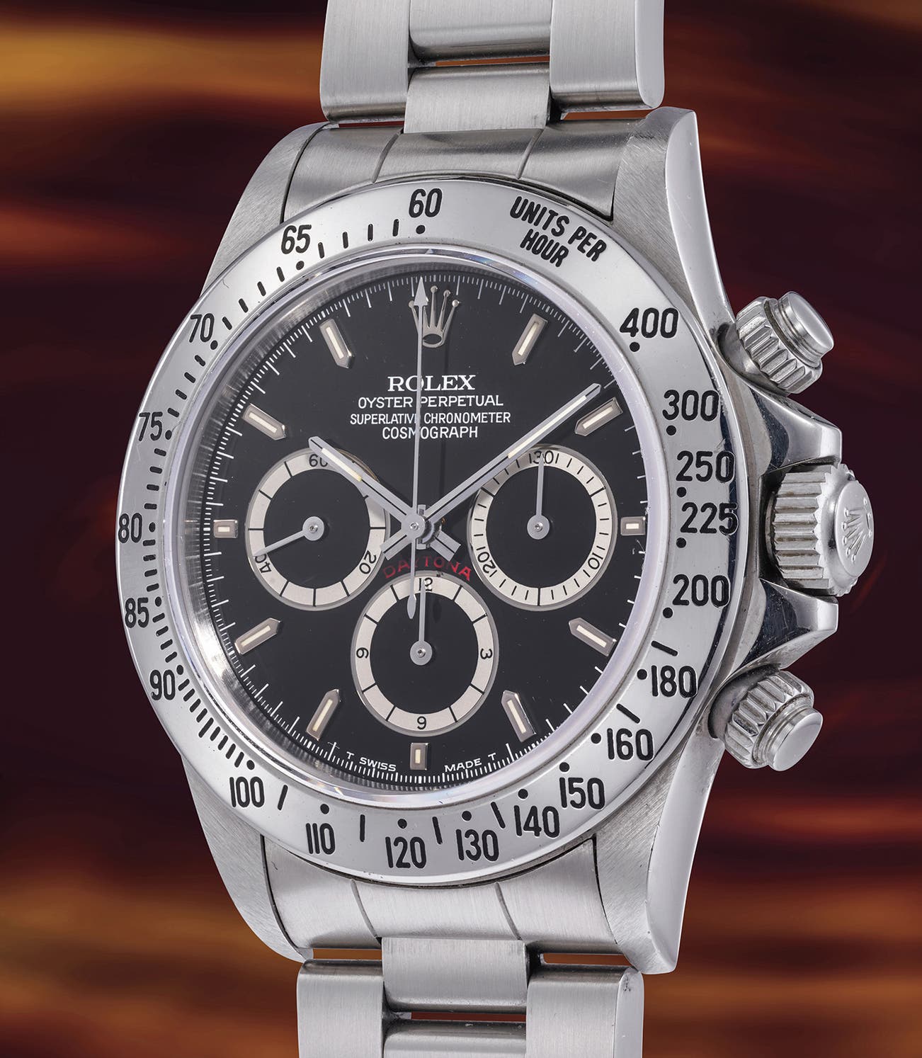 Growing in demand, the Cosmograph Daytona’s evergreen modern design has garnered the attention from vintage collectors all around the globe, and have become on the most sought after sports watch. Produced in circa 1989, the present example bearing an L serial is from the rare and coveted early examples of Zenith Daytona. The first half of the production of the “L” series houses a 4-Liner dial with a MK I 200 units per hour bezel insert, followed by a very short run of MK II bezel like the present example, where the bezel was modified with a scale for 400, 250 and 225 indication, and “units per hour” has been relocated to 1 o’clock position. Adding attraction to this incredibly well-preserved example is the feature of an inverted 6 on the 12-hour register, making this one of the most desirable combination from the series.
