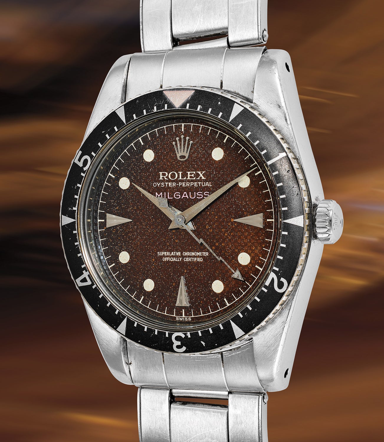 Phillips is honored to offer for the first time in our history, a Rolex Milgauss reference consigned directly by the original owner. Manufactured in 1958, the most prominent feature of the watch is its unusual and somewhat whimsical seconds hand in the shape of a lightning bolt. Giving the watch an unmistakable appearance is the beautifully preserved and exceedingly rare “honeycomb” dial that has aged to a stunning and uniform “tropical” brown hue with non-luminous circular hour markers and faceted triangular indexes at 3, 6, and 9 o’clock. The originally red “Milgauss” designation has faded to pink. Its case number 412’155 is consistent with other examples of the reference, as most appear to bear a 412’xxx serial number. Fitted with Rolex’s caliber 1066, its bridge features an engraved ‘M’ specific only to the Milgauss model.