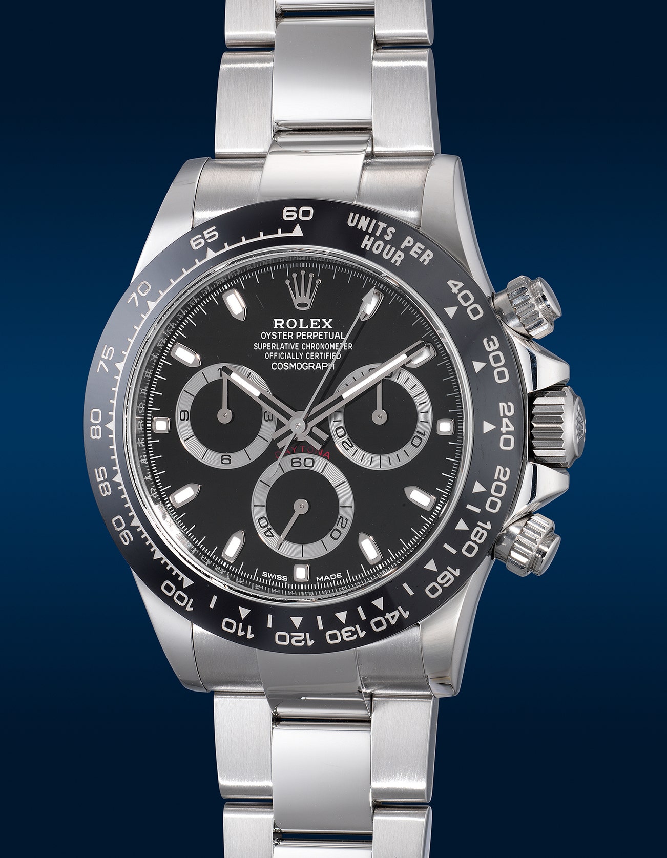 - The present example in black dial is offered in virtually unworn condition, complete with all of its original accessories. Recently discontinued and replaced by the new ref. 126500LN, the present Daytona represents a rare opportunity to acquire one of Rolex's most sought-after contemporary chronographs.