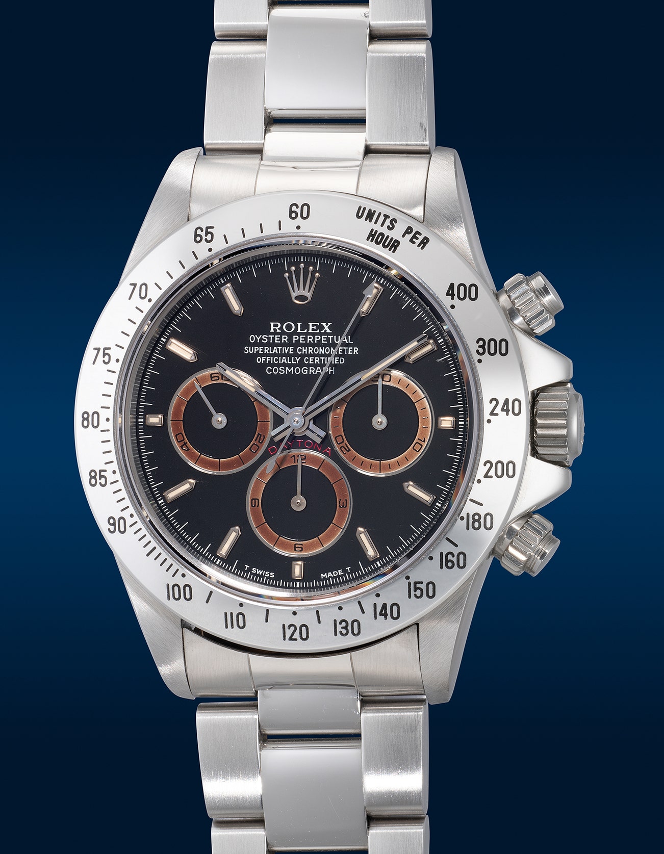 - This particular watch, the registers were aged uniformly to a brownish hue. Presented in excellent overall condition, it exhibits minimal signs of wear, and the caseback still retains its original green Rolex sticker. With a "W" serial number, this example would be an excellent choice for Rolex enthusiasts seeking an attractive and distinctive Daytona timepiece.