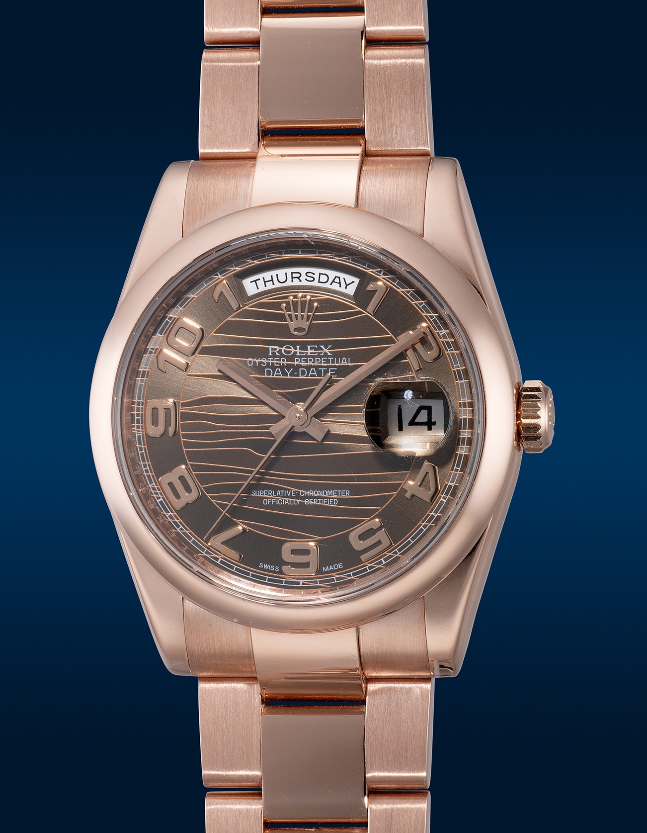 A rare and unusual pink gold wristwatch with center seconds, day, date, brown Arabic numeral “wave” dial, Oyster bracelet and guarantee