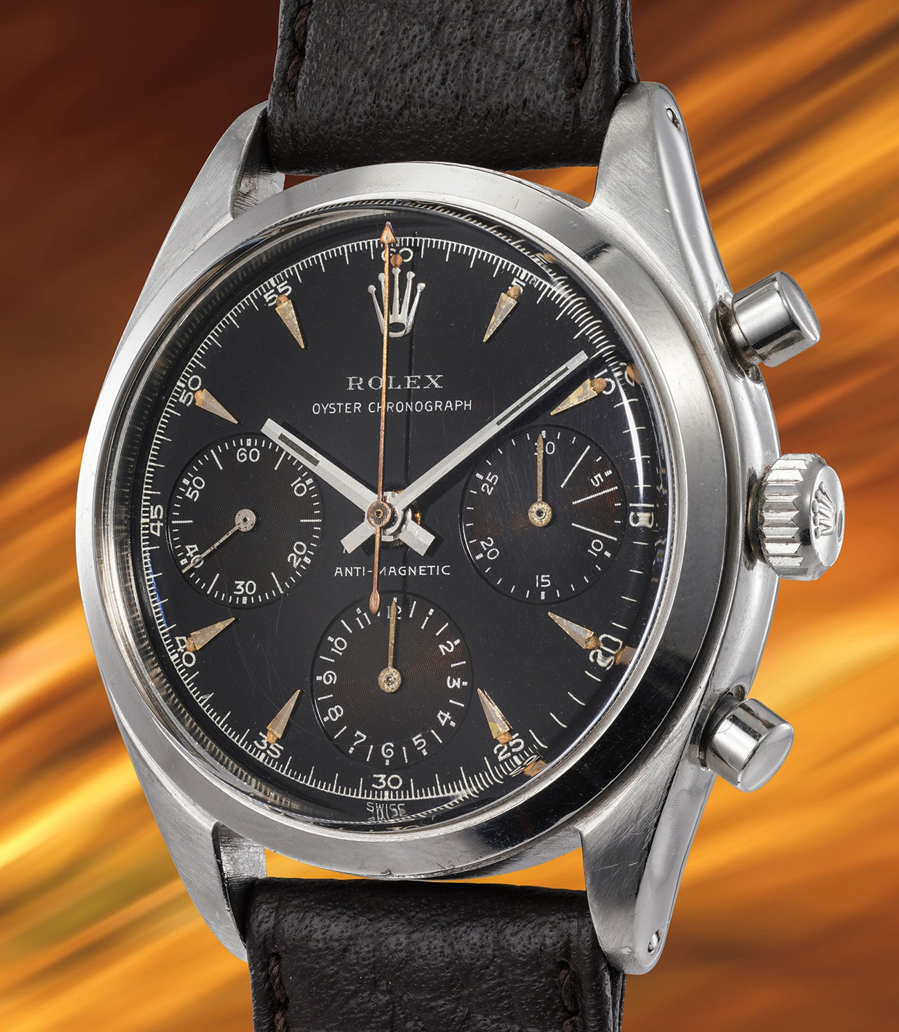 With its superb glossy black dial, lack of scales and applied indexes, the present lot is certainly a trophy for the collector of vintage Rolex sport watches.