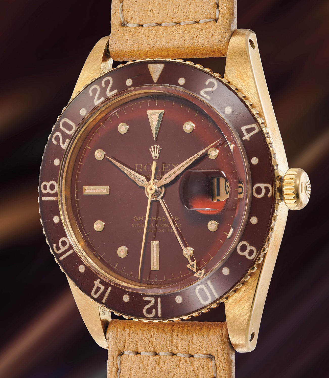 Given that the GMT-Master was created for specific, work-related purposes, most examples were cased in stainless steel. These watches were worn in the most practical sense and made to withstand the elements. Yet, Rolex also manufactured a very limited number of watches cased in yellow gold, and fitted with a brown bakelite bezel. Due to the immense fragility of these watches, it is incredibly rare to find examples fitted with their original bakelite insert. The fact is even more pertinent as most of the bakelite bezels were recalled by Rolex due to their radium content. The original GMT-Master eventually ceased production in 1959.