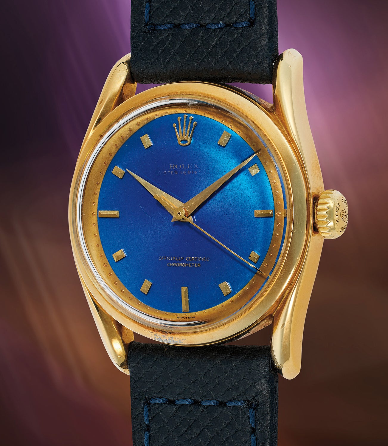 The present Rolex reference 6102, also referred to as the “Bombé”, was made in 1953, and impresses with its richly shimmering dial of sapphire blue. Renowned Genevan dial maker, Stern Frères, made stunning dials such as these and each one is designated with its own code. The first number would be the company, which in this instance is Rolex, followed by a star for the dial maker, Stern. The final part of the code is the actual job number, which is specific to each dial. The job number helps us to figure out how many of each dial was made, along with the designated name of the dial decoration.