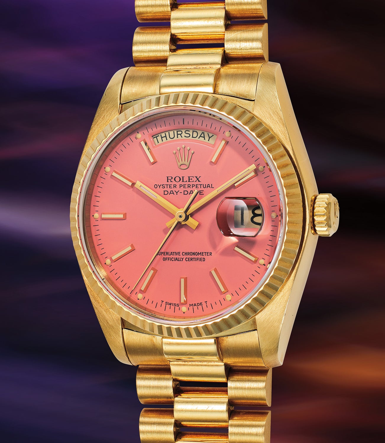 Introduced in the exciting period of the 1970s and produced for roughly a decade, these colorful lacquered dials were manufactured by a company called Stella, based in Châtelaine and Geneva. The firm supplied Rolex’s dial makers of the period with special types of lacquer that resulted in the name it proudly deserves. The present ref. 18038 features a rare and desireable color, the “candy” pink. Contrasting beautifully against a yellow gold case, the combination is considered one of the more sought after configurations of Stella Day-Date.