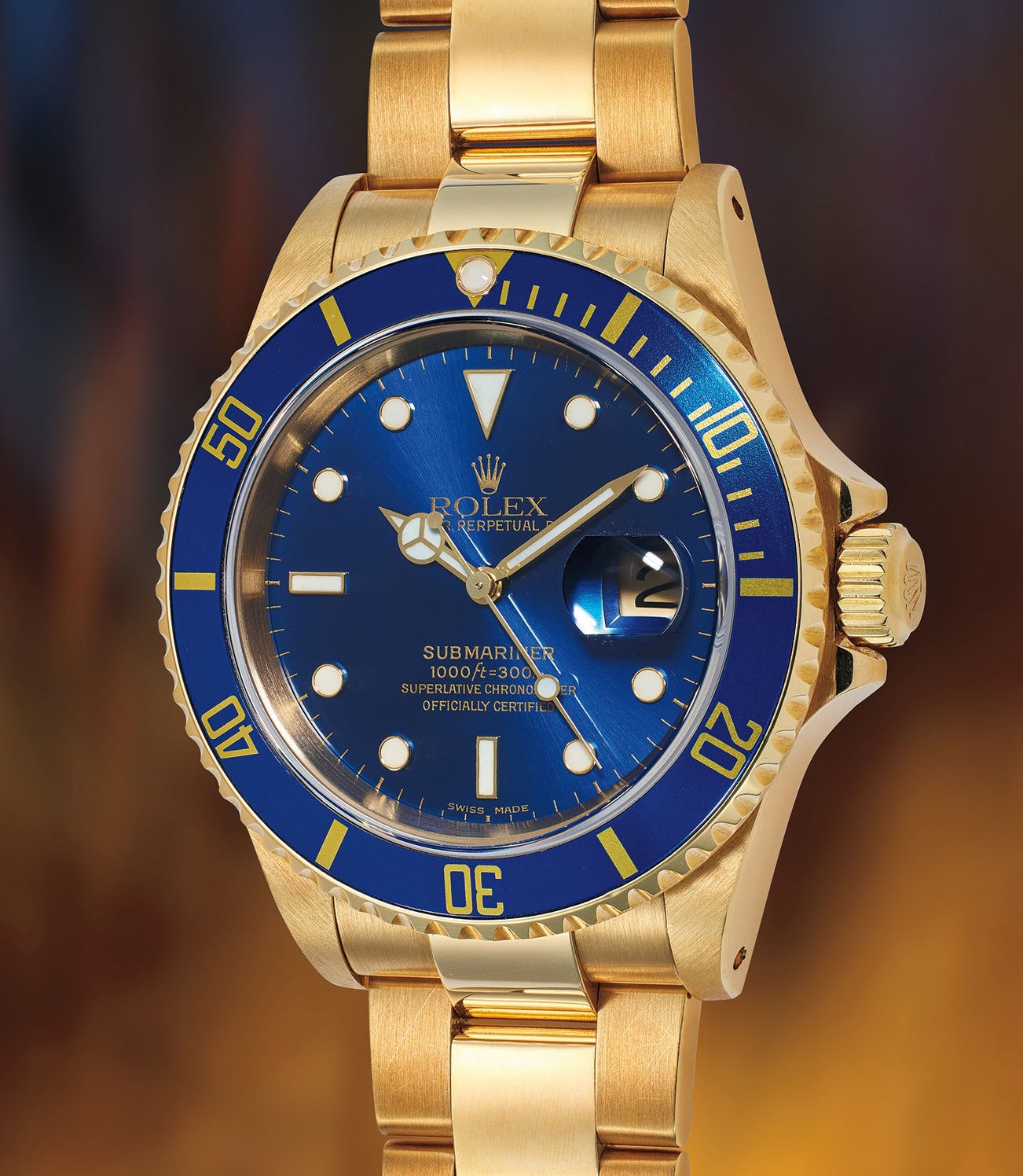 An attractive, sporty, and well-preserved yellow gold diver’s wristwatch with date, bracelet, guarantee, and presentation box