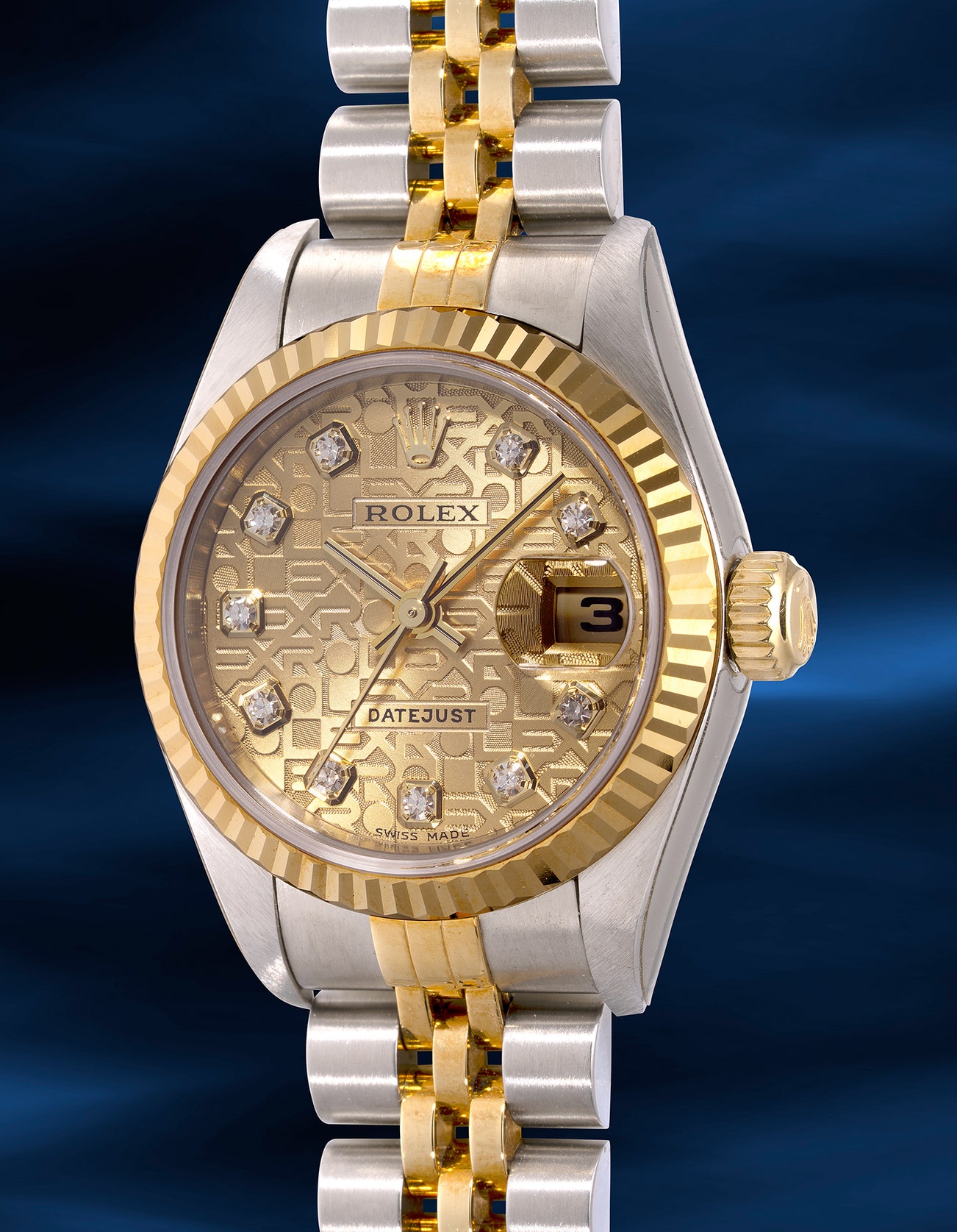 - This present ref. 79173 features a distinctive two-tone case constructed of 18k yellow gold and stainless steel. Complementing the case is a champagne dial adorned with diamond-set indexes, adding a touch of refined luxury to this classic design.