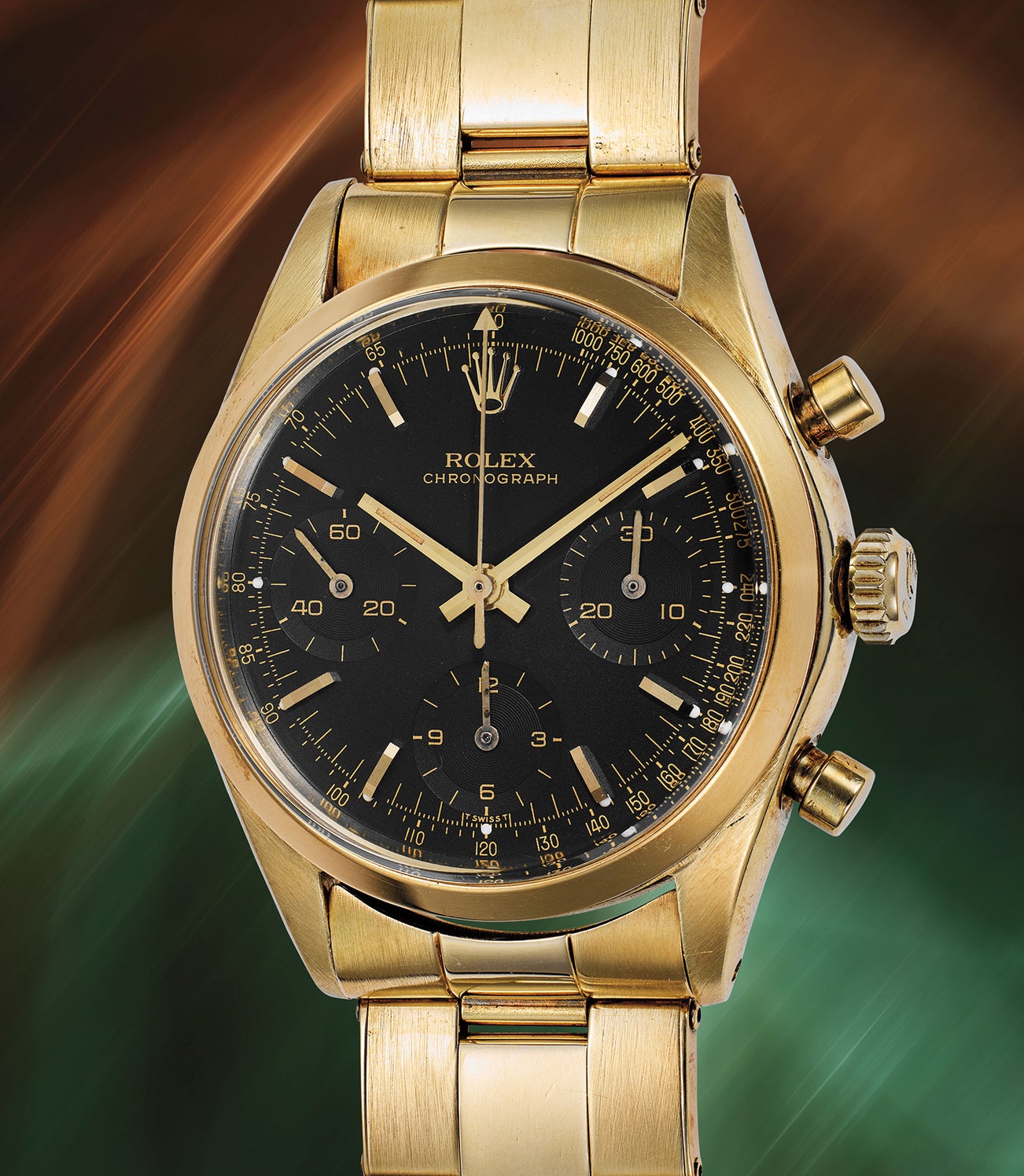 The present reference 6238 is an incredibly rare example cased in 14K gold with black dial. Mostly used by Rolex for watches destined for the American market, 14K gold had lower import duties than 18K gold. Indeed the movement of the present watch confirms this theory, as it is stamped ‘ROW’ – the import code required by the U.S.