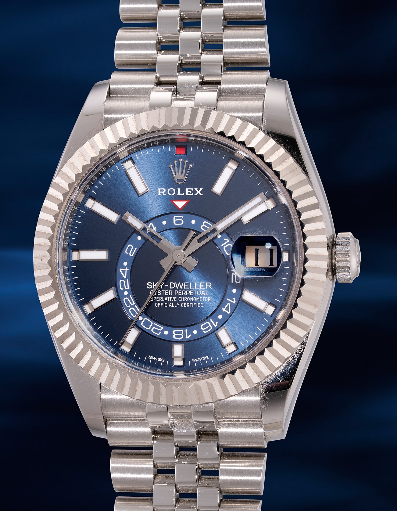 - The present Rolesor Sky-Dweller ref. 326934 with a blue dial is perhaps the most elusive iteration of this model. The luxury apprehended from this white gold and steel reference is largely that of something engineered with great precision and attention to detail, and not a luxury of materials or elaborate ornamental techniques. Presented in excellent condition with its full set of original accessories, this is a fantastic opportunity to promptly acquire this much sought-after wristwatch.