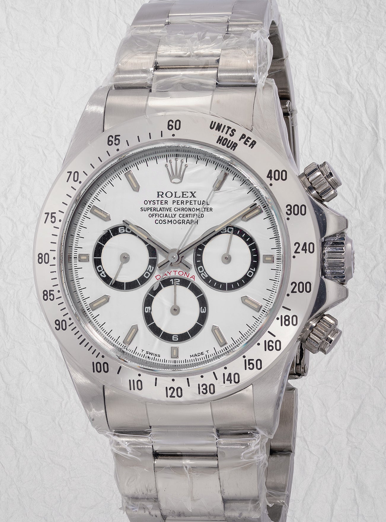 The present “new-old-stock” white dial example not only still retains the original Japanese caseback sticker, but the case, bracelet, and clasp are all wrapped in original plastic as if it was delivered directly from the retailer. The U-serial 16520 features a regular-6 dial and was produced from 1997 to 1998.This watch with a serial of "U603'066" still bears the Tritium lumes, as indicated by the "T Swiss Made T" dial, making it one of the last batches to leave the manufacture before Rolex started to use another luminescent material named LumiNova, manufactured by the Japanese company Nemoto & Co., which began to be seen in the late U-serial examples.