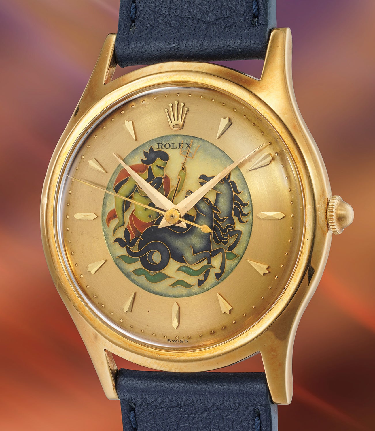 Rolex has long reserved its finest and most outstanding work for its most exclusive clients - a trend that goes on today with the infamously impossible to obtain out-of-catalogue pieces. While the company is obviously best known for its sport's and professional model, they have conducted throughout their history rare but extremely impressive forays in the realm of high watchmaking. From the mechanical point of view, examples of this trend are the triple calendar with moonphases pieces from the 1950s or the Datocompax models from the 1940s. Surprisingly though, Rolex attempted - and awesomely succeeded as this watch testifies - watches which would today fall in the "Rare Handcraft" category: enamelled timepieces. Particularly during the 1940s and 1950s, Rolex commissioned the dial maker Stern Frères - arguably the best on the market at the time - a remarkably scarce amount of enamel dials. Most of these consist in the sublime monochrome Grand Feu enamel dials found on models such as ref. 6102. The true masterpieces are however the cloisonne' enamel dials such as the present "Neptune" dial - of which only other 2 examples are known, one of them prominently illustrated and described in 100 Superlative Rolex Watches by John Goldberger, pp. 46 & 47.